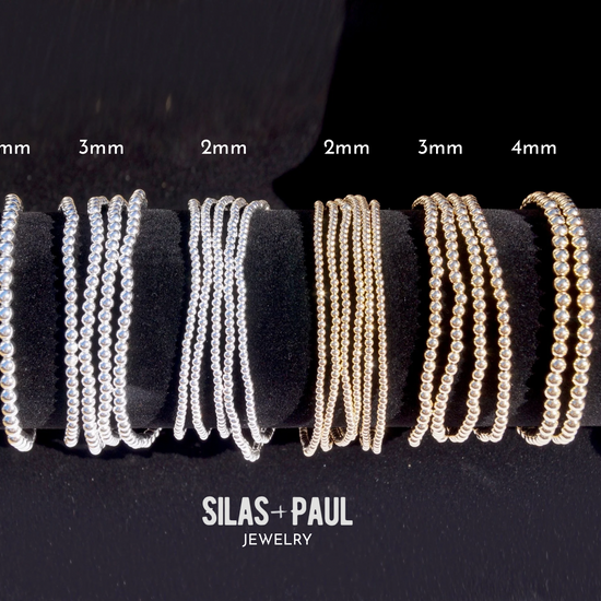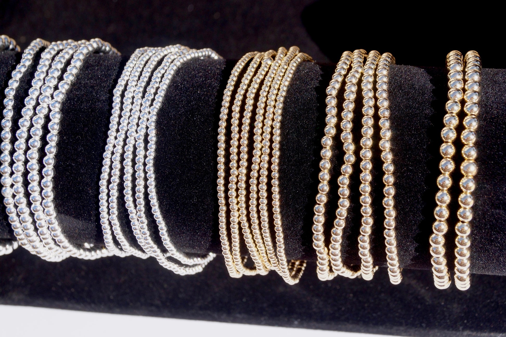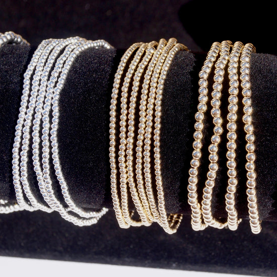 Waterproof and pre-stretched, these simple gold filled or sterling silver stretch bracelets are the perfect compliment to your bracelet stack or on their own.