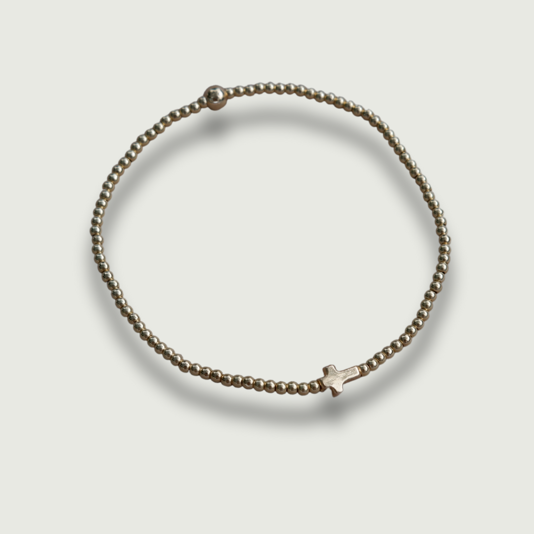 A single dainty 2mm gold filled beaded stretch bracelet with a gold filled cross.